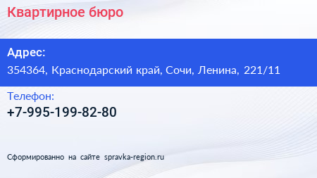 Квартирное бюро по адресу 354364, Краснодарский край, Сочи, Ленина, 221/11 в дальнейшем Организация, размещена в следующих категориях: