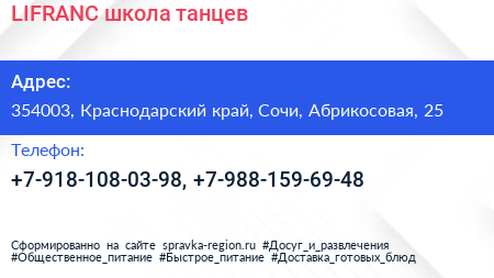 LIFRANC, школа танцев по адресу 354003, Краснодарский край, Сочи, Абрикосовая, 25 в дальнейшем Организация, размещена в следующих категориях: