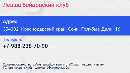 Левша, бойцовский клуб по адресу 354382, Краснодарский край, Сочи, Голубые Дали, 16 в дальнейшем Организация, размещена в следующих категориях: