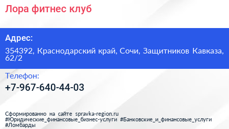 Лора, фитнес-клуб по адресу 354392, Краснодарский край, Сочи, Защитников Кавказа, 62/2 в дальнейшем Организация, размещена в следующих категориях: