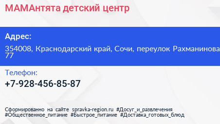 МАМАнтята, детский центр по адресу 354008, Краснодарский край, Сочи, переулок Рахманинова, 77 в дальнейшем Организация, размещена в следующих категориях: