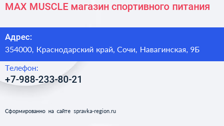 MAX-MUSCLE, магазин спортивного питания по адресу 354000, Краснодарский край, Сочи, Навагинская, 9Б в дальнейшем Организация, размещена в следующих категориях: