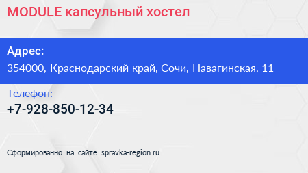 MODULE, капсульный хостел по адресу 354000, Краснодарский край, Сочи, Навагинская, 11 в дальнейшем Организация, размещена в следующих категориях: