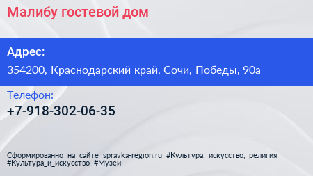 Малибу, гостевой дом по адресу 354200, Краснодарский край, Сочи, Победы, 90а в дальнейшем Организация, размещена в следующих категориях: