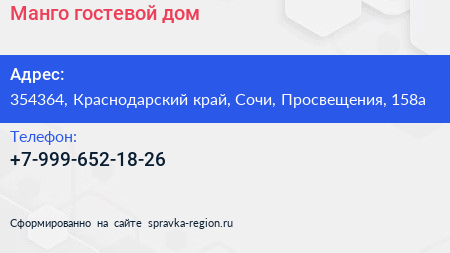 Манго, гостевой дом по адресу 354364, Краснодарский край, Сочи, Просвещения, 158а в дальнейшем Организация, размещена в следующих категориях: