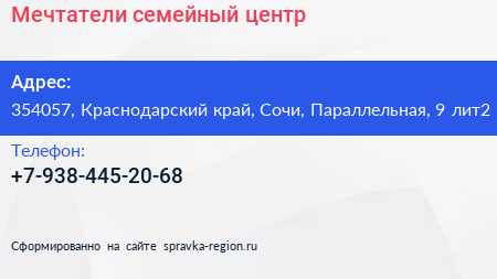 Мечтатели, семейный центр по адресу 354057, Краснодарский край, Сочи, Параллельная, 9 лит2 в дальнейшем Организация, размещена в следующих категориях: