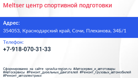 Meltser, центр спортивной подготовки по адресу 354053, Краснодарский край, Сочи, Плеханова, 34Б/1 в дальнейшем Организация, размещена в следующих категориях: