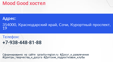 Mood Good, хостел по адресу 354000, Краснодарский край, Сочи, Курортный проспект, 19 в дальнейшем Организация, размещена в следующих категориях: