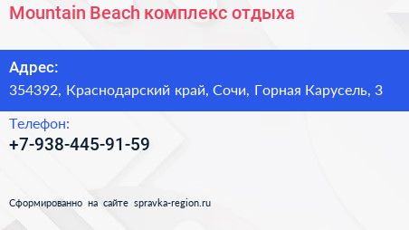 Mountain Beach, комплекс отдыха по адресу 354392, Краснодарский край, Сочи, Горная Карусель, 3 в дальнейшем Организация, размещена в следующих категориях: