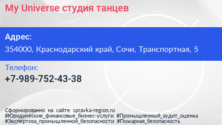 My Universe, студия танцев по адресу 354000, Краснодарский край, Сочи, Транспортная, 5 в дальнейшем Организация, размещена в следующих категориях: