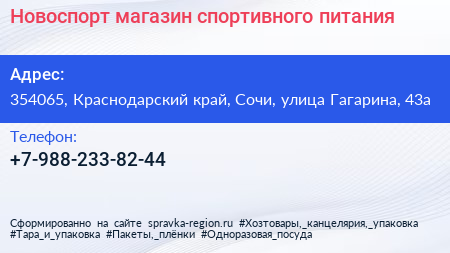 Новоспорт, магазин спортивного питания по адресу 354065, Краснодарский край, Сочи, улица Гагарина, 43а в дальнейшем Организация, размещена в следующих категориях: