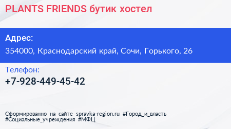 PLANTS & FRIENDS, бутик-хостел по адресу 354000, Краснодарский край, Сочи, Горького, 26 в дальнейшем Организация, размещена в следующих категориях: