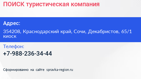 ПОИСК, туристическая компания по адресу 354208, Краснодарский край, Сочи, Декабристов, 65/1 киоск в дальнейшем Организация, размещена в следующих категориях: