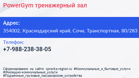 PowerGym, тренажерный зал по адресу 354002, Краснодарский край, Сочи, Транспортная, 80/283 в дальнейшем Организация, размещена в следующих категориях: