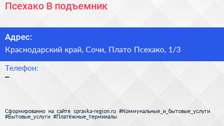 Псехако B, подъемник по адресу Краснодарский край, Сочи, Плато Псехако, 1/3 в дальнейшем Организация, размещена в следующих категориях: