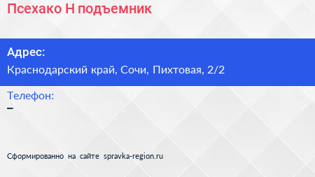 Псехако H, подъемник по адресу Краснодарский край, Сочи, Пихтовая, 2/2 в дальнейшем Организация, размещена в следующих категориях:
