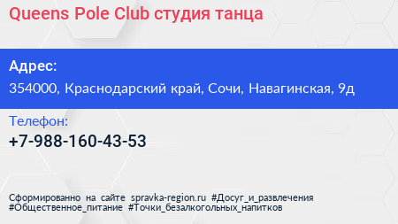 Queens Pole Club, студия танца по адресу 354000, Краснодарский край, Сочи, Навагинская, 9д в дальнейшем Организация, размещена в следующих категориях: