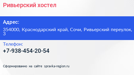 Ривьерский, хостел по адресу 354000, Краснодарский край, Сочи, Ривьерский переулок, 3 в дальнейшем Организация, размещена в следующих категориях: