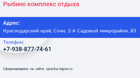 Рыбино, комплекс отдыха по адресу Краснодарский край, Сочи, 2-й Садовый микрорайон, 83 в дальнейшем Организация, размещена в следующих категориях: