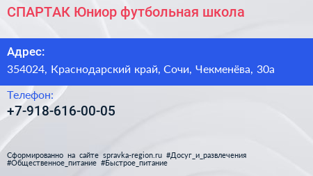 СПАРТАК-Юниор, футбольная школа по адресу 354024, Краснодарский край, Сочи, Чекменёва, 30а в дальнейшем Организация, размещена в следующих категориях: