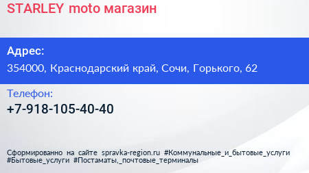 STARLEY moto, магазин по адресу 354000, Краснодарский край, Сочи, Горького, 62 в дальнейшем Организация, размещена в следующих категориях: