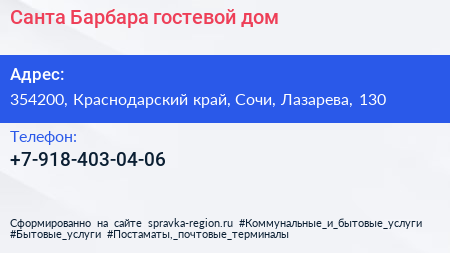 Санта-Барбара, гостевой дом по адресу 354200, Краснодарский край, Сочи, Лазарева, 130 в дальнейшем Организация, размещена в следующих категориях: