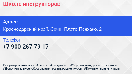 Школа инструкторов по адресу Краснодарский край, Сочи, Плато Псехако, 2 в дальнейшем Организация, размещена в следующих категориях: