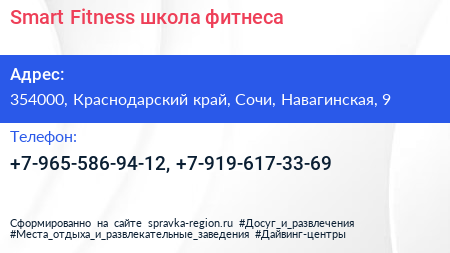 Smart Fitness, школа фитнеса по адресу 354000, Краснодарский край, Сочи, Навагинская, 9 в дальнейшем Организация, размещена в следующих категориях: