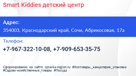 Smart Kiddies, детский центр по адресу 354003, Краснодарский край, Сочи, Абрикосовая, 17а в дальнейшем Организация, размещена в следующих категориях: