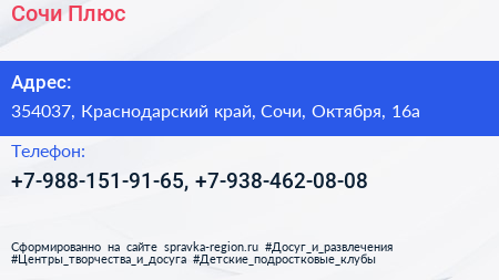 Сочи-Плюс по адресу 354037, Краснодарский край, Сочи, Октября, 16а в дальнейшем Организация, размещена в следующих категориях:
