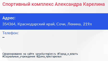 Спортивный комплекс Александра Карелина по адресу 354364, Краснодарский край, Сочи, Ленина, 219л в дальнейшем Организация, размещена в следующих категориях: