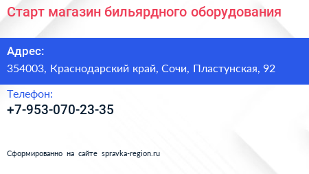 Старт, магазин бильярдного оборудования по адресу 354003, Краснодарский край, Сочи, Пластунская, 92 в дальнейшем Организация, размещена в следующих категориях: