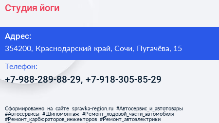 Студия йоги по адресу 354200, Краснодарский край, Сочи, Пугачёва, 15 в дальнейшем Организация, размещена в следующих категориях: