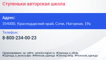 Ступеньки, авторская школа по адресу 354000, Краснодарский край, Сочи, Нагорная, 19а в дальнейшем Организация, размещена в следующих категориях:
