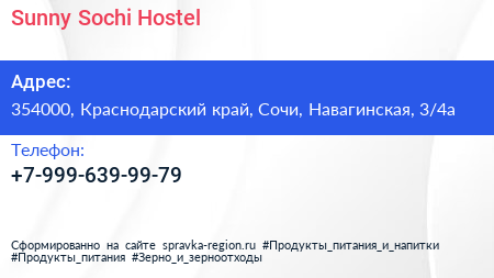 Sunny Sochi Hostel по адресу 354000, Краснодарский край, Сочи, Навагинская, 3/4а в дальнейшем Организация, размещена в следующих категориях: