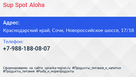 Sup Spot Aloha по адресу Краснодарский край, Сочи, Новороссийское шоссе, 17/18 в дальнейшем Организация, размещена в следующих категориях: