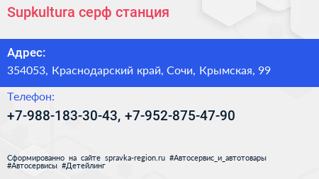 Supkultura, серф-станция по адресу 354053, Краснодарский край, Сочи, Крымская, 99 в дальнейшем Организация, размещена в следующих категориях: