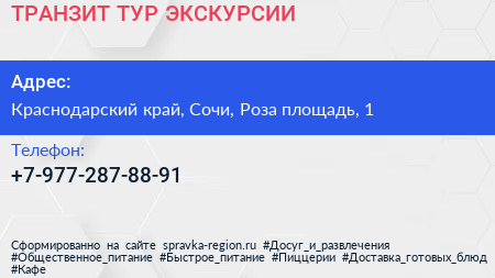 ТРАНЗИТ ТУР ЭКСКУРСИИ по адресу Краснодарский край, Сочи, Роза площадь, 1 в дальнейшем Организация, размещена в следующих категориях:
