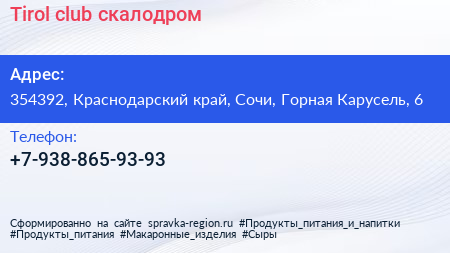 Tirol club, скалодром по адресу 354392, Краснодарский край, Сочи, Горная Карусель, 6 в дальнейшем Организация, размещена в следующих категориях: