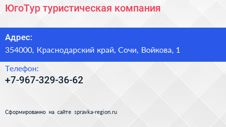 ЮгоТур, туристическая компания по адресу 354000, Краснодарский край, Сочи, Войкова, 1 в дальнейшем Организация, размещена в следующих категориях: