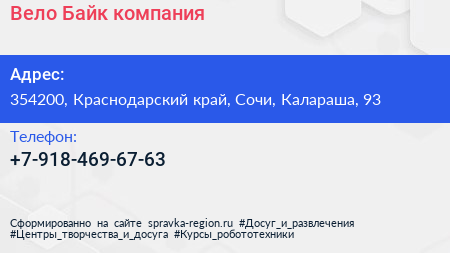 Вело Байк, компания по адресу 354200, Краснодарский край, Сочи, Калараша, 93 в дальнейшем Организация, размещена в следующих категориях: