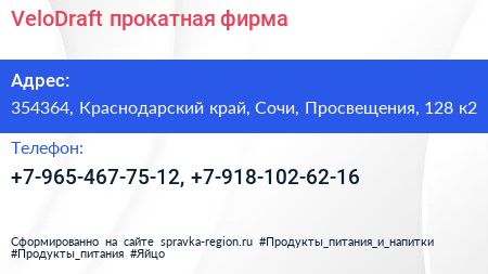 VeloDraft, прокатная фирма по адресу 354364, Краснодарский край, Сочи, Просвещения, 128 к2 в дальнейшем Организация, размещена в следующих категориях: