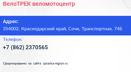 ВелоТРЕК, веломотоцентр по адресу 354002, Краснодарский край, Сочи, Транспортная, 74Б в дальнейшем Организация, размещена в следующих категориях: