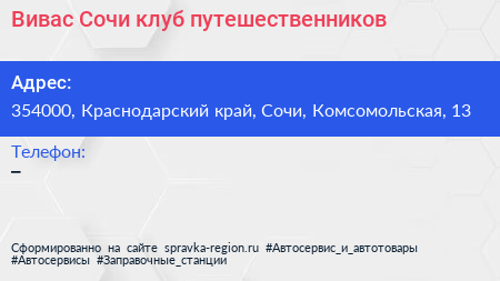 Вивас Сочи, клуб путешественников по адресу 354000, Краснодарский край, Сочи, Комсомольская, 13 в дальнейшем Организация, размещена в следующих категориях: