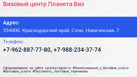 Визовый центр Планета Виз по адресу 354000, Краснодарский край, Сочи, Навагинская, 7 в дальнейшем Организация, размещена в следующих категориях: