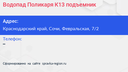 Водопад Поликаря К13, подъемник по адресу Краснодарский край, Сочи, Февральская, 7/2 в дальнейшем Организация, размещена в следующих категориях: