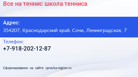 Все на теннис, школа тенниса по адресу 354207, Краснодарский край, Сочи, Ленинградская, 7 в дальнейшем Организация, размещена в следующих категориях: