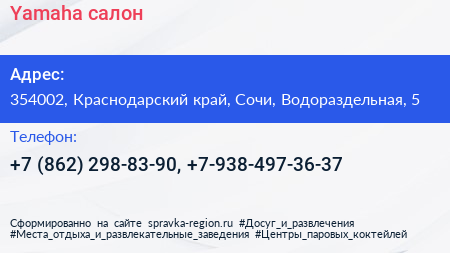 Yamaha, салон по адресу 354002, Краснодарский край, Сочи, Водораздельная, 5 в дальнейшем Организация, размещена в следующих категориях: