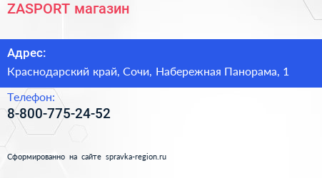 ZASPORT, магазин по адресу Краснодарский край, Сочи, Набережная Панорама, 1 в дальнейшем Организация, размещена в следующих категориях: