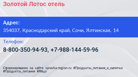 Золотой Лотос, отель по адресу 354037, Краснодарский край, Сочи, Ялтинская, 14 в дальнейшем Организация, размещена в следующих категориях: